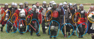 頬当のついた古代風の兜が基本ですが、よく見ると、ローマ風のガレアでもなんでもない、単なるバーグリルヘルムを使っている人もいるようです。