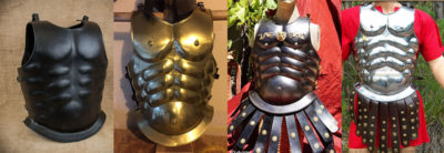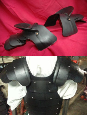 胴鎧が黒い場合、レンタルアーマーの肩鎧が割とローマっぽい形状をしていますので、これをくっつければ割とそれっぽく見えるんじゃないでしょうか。プラアーマーの中には、下図右のようなものもあります。